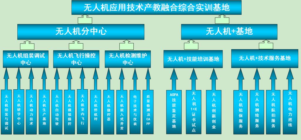无人机应用技术产教融合实训基地建有无人机组装调试中心、无人机飞行操控中心、无人机检测维护中心三个中心和无人机+技术服务基地、无人机+技能培训基地两个基地,涵盖无人机应用技术的各个方面。总占地面积3000余平方米,基地资产总值2200余万元,教学仪器设备资产总值1200余万元。