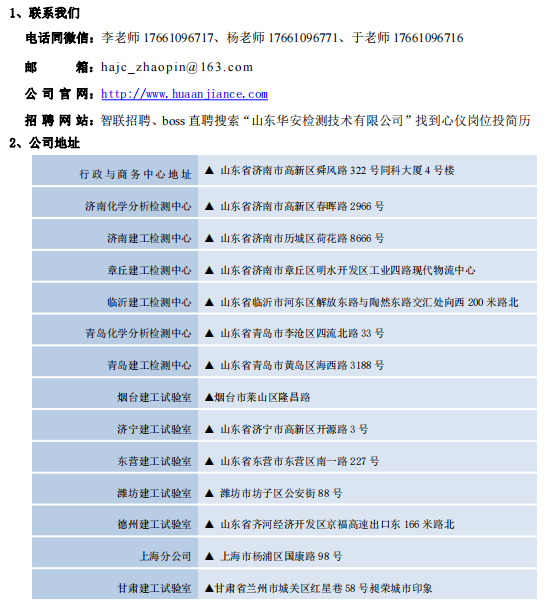 山东华安检测技术有限公司成立于2014年4月,公司以“提供一站式检测服务,为质量和安全传递信任”为使命。其前身山东亘富工程质量安全检测有限公司成立于2006年,奠定了华安检测品牌的基石。华安检测目前资质涵盖:建筑工程检测、工程鉴定检测、市政工程检测、水利工程检测、道路工程检测、桥梁工程检测、消防设施检测、防雷设施检测、电气防火检测、特种设备无损检测、环境检测及评价、职业卫生检测及评价、公共卫生检测与评价、信息安全等级保护测评、人防工程防护设备检测、饲料检测、肥料检测等。公司专注于第三方检测服务,历经多个发展阶段,逐渐成熟,发展成为行业优选品牌。华安检测总部位于济南市高新区舜风路322号同科创业园4号楼、7号楼,技术部门下设化学检测中心、特检检测中心、消防检测中心、主体及钢结构检测中心、建筑材料检测中心、地基基础检测、路桥工程检测中心、信息工程检测中心,职能部门下设市场发展、质控、行政、人资、财务、培训六个部门。目前公司在山东省内各地市已布局近30个实验室并投入运营,基本完成省内布局以及县市区级市场的全面覆盖,同时设立鲁东、鲁北、鲁中、鲁南、鲁西五个大区服务省内客户。并在甘肃、上海、内蒙等地设立分部、建立实验室,并与济南大学、同济大学合作,联合创办实验室,逐步打开国内市场,树立行业品牌。